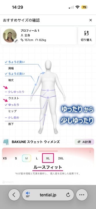 XLサイズの場合は、以下のように少しゆったりからゆったりといった感じの「ルースフィット」というサイズ感の結果が出ました。↓