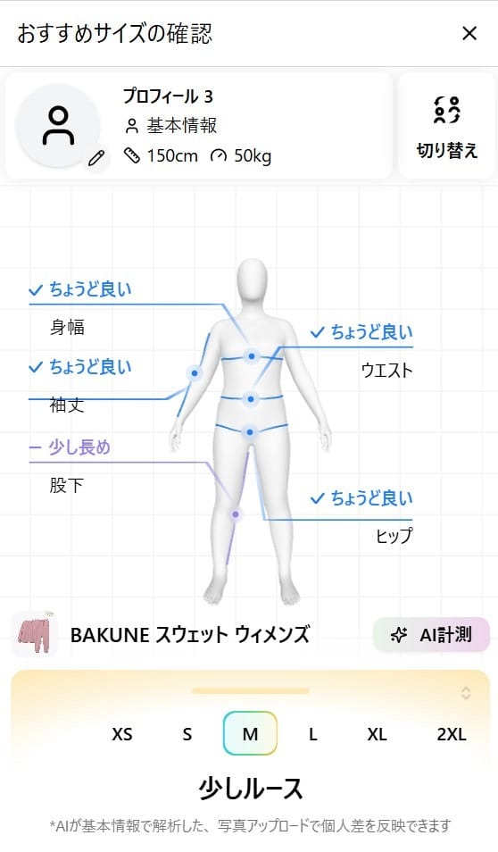 Mさんの情報(筆者の推定を含む)をもとに、Mさんに合ったBAKUNE スウェット ウィメンズのサイズを、サイズ選びを助ける「自分に合ったサイズを探す」機能を使って調べてみました。