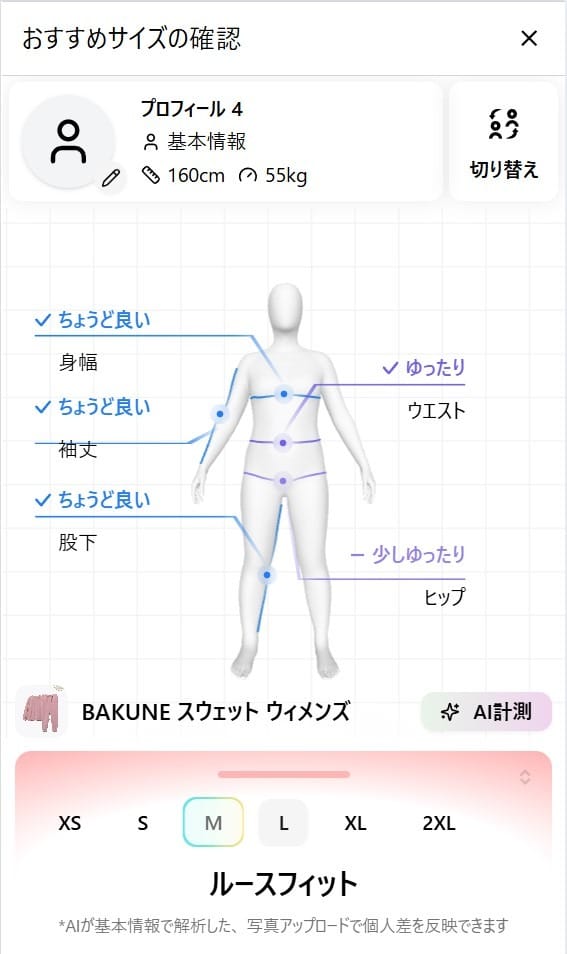 より正確に自分に合ったBAKUNE スウェット ウィメンズのサイズを探したい場合は、「自分に合ったサイズを探す」機能の中にある「AI計測」の機能を使う事もできます。↓