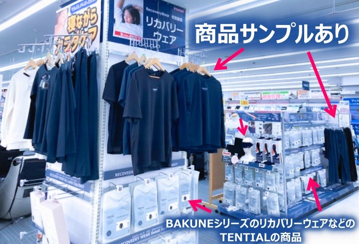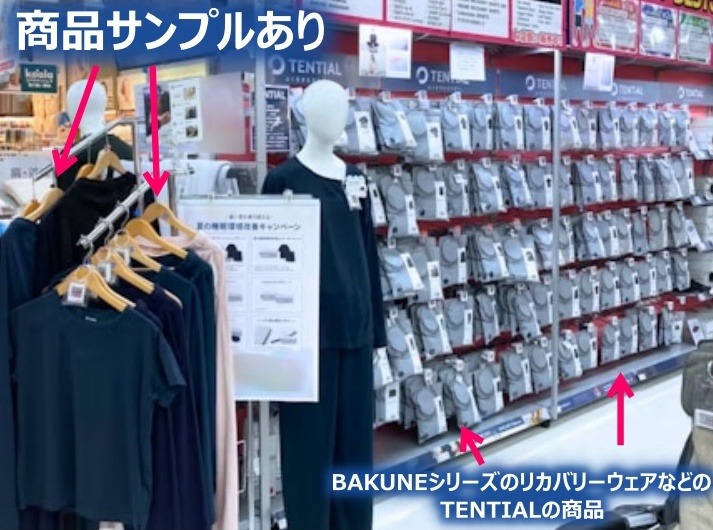 ビックカメラ 池袋本店のTENTIALの販売コーナー。BAKUNEシリーズのリカバリーウェアを販売しています。↓