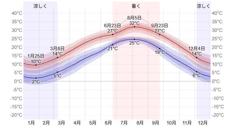 冬(12月~2月): 平均気温:6~8℃ 平均最低気温:2~4℃ 平均湿度:60%台後半