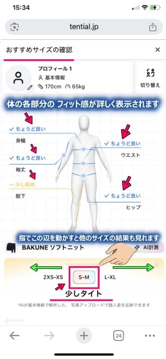 自分に合ったBAKUNE ベロアのサイズが知りたい場合は、商品ページのサイズ欄の下にある「自分に合ったサイズを探す」という機能を是非使ってみてください。スマホで自撮りしたり、簡単な質問に答える事で、「自分に合ったサイズ」選びを助けてくれますよ!↓