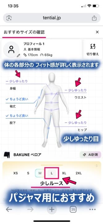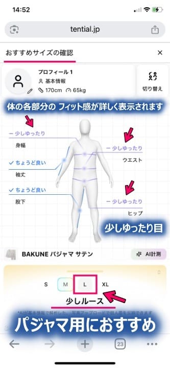 筆者のBAKUNE パジャマ サテンの「おすすめサイズ」。↓