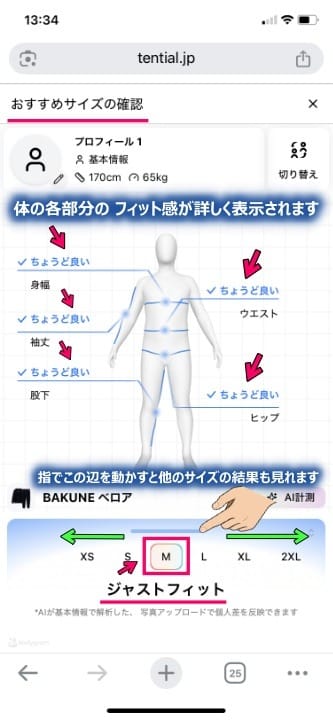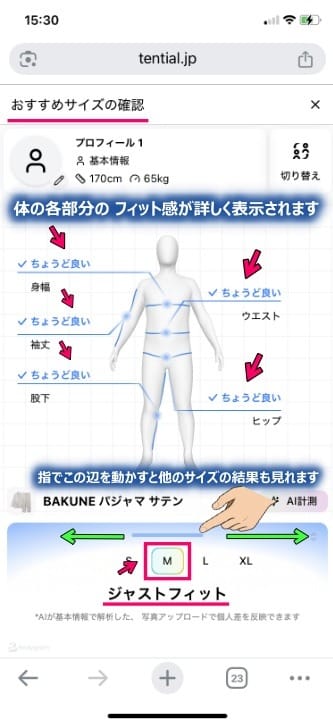 筆者の場合、ジャストフィットでMサイズが選ばれました。