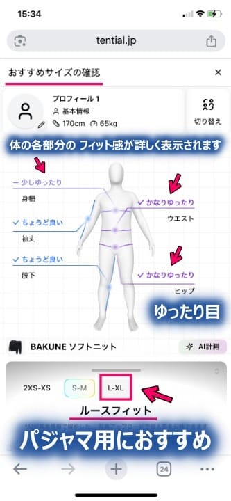 筆者の場合、L-XLが「ルースフィット」と出ました。