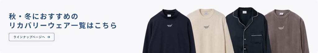 【補足】リカバリーウェアの下に着る肌着は、できる限り通気性の良く、汗をかいても速乾性があるタイプがおすすめです。そうでないタイプは、寝ている間に汗をかいた際に、汗が肌着に残り、最終的には汗が冷えて、体が冷えすぎて、睡眠環境に影響を及ぼしかねません。ですので、注意して下さい。