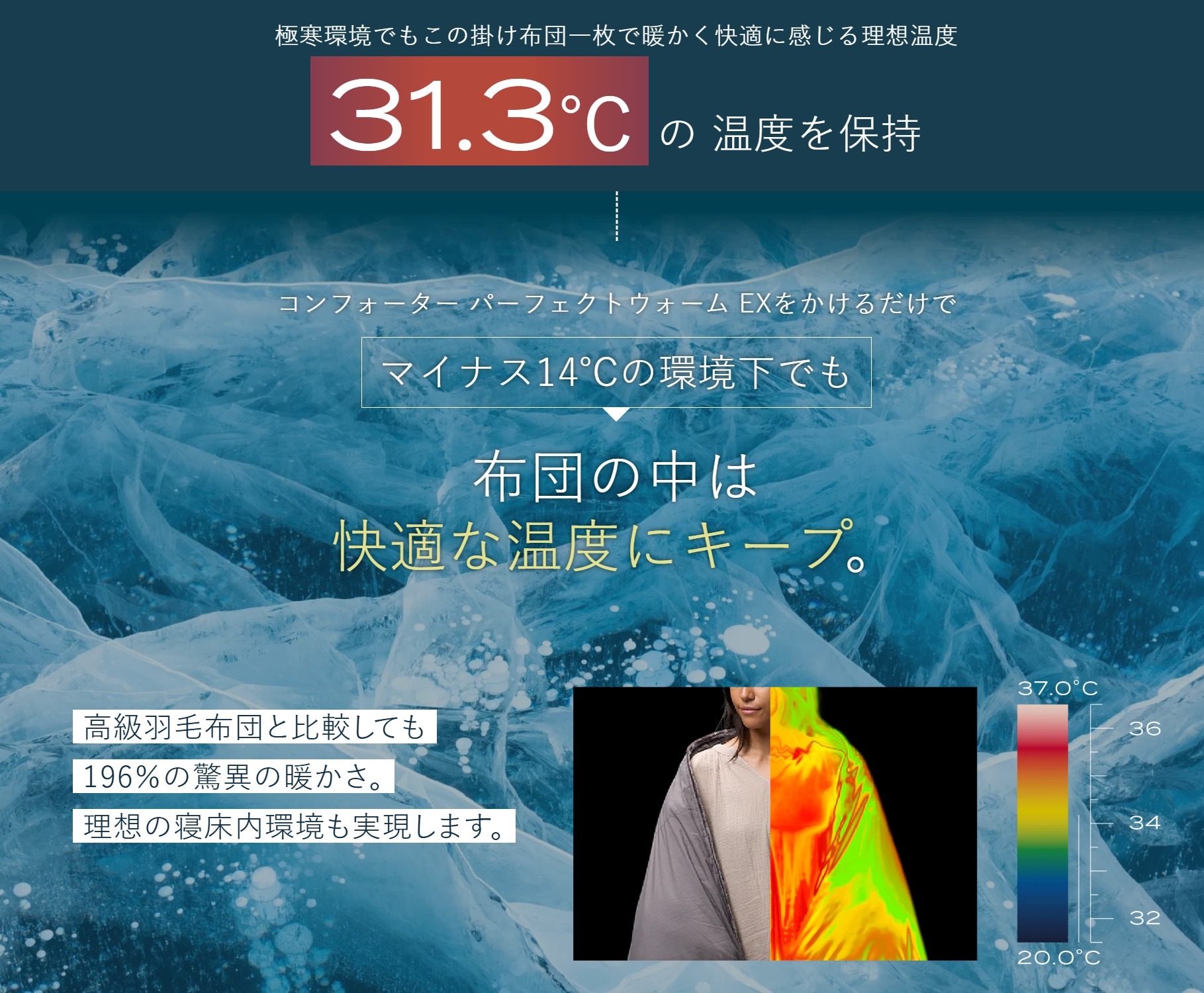 コンフォーター パーフェクトウォームEXの生地の裏面に断熱作用が期待できるカーボン加工を施し、布団内部の暖かさは逃がさず、かつ、外の冷気をシャットアウト。そのため、寝床内温度がコントロールしやすい仕様になっています。