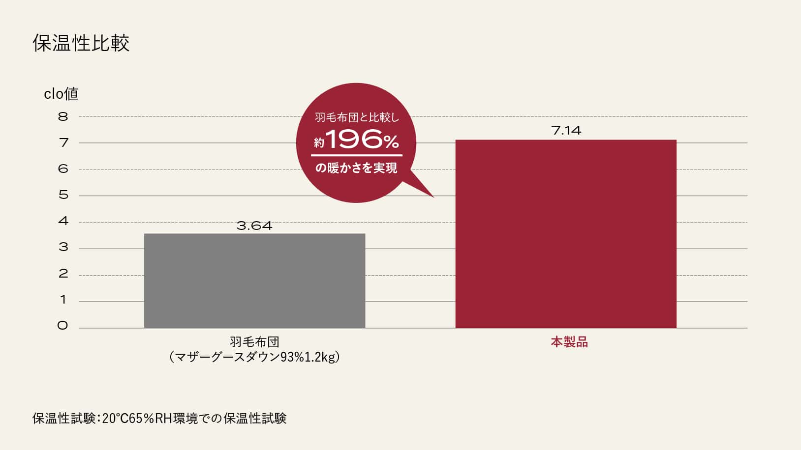 また、他の実験では、高品質のグースダウン羽毛布団比較して、約196%保温性がある事が分かりました。