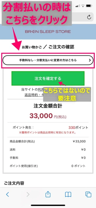 「手数料なし・分割支払いに変更の方はこちら」のボタンは白で、「注文を確定する」の緑のボタンの比べあまり目立ちません。