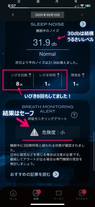 このアプリの「呼吸モニタリングアラート」機能が、睡眠時無呼吸症候群リスクレベルを教えてくれます。↓