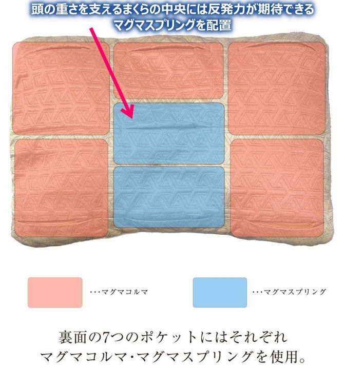 - マグマスプリング:中央部に配置。高反発で頭部をしっかり支える。柔軟性のある素材を使用。