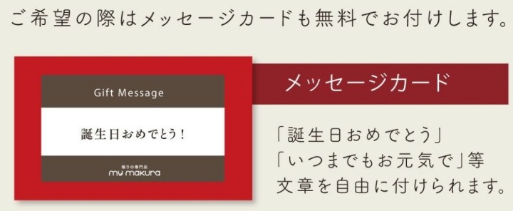 「お誕生日おめでとう」、「いつまでもお元気で」などのメッセージカードを無料で同封する事ができます。↓