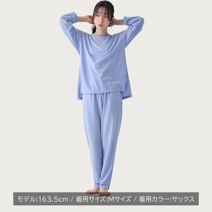2つ目はサイドスリット入りの長袖トップス+ロングテーパードパンツのセット。すっきりとした大人っぽいシルエットで、ゆったり過ごしながらも見た目がきれいにまとまるリカバリーウェアです。