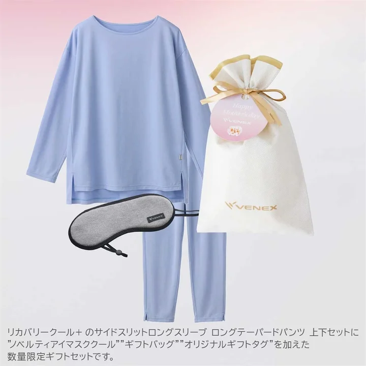 今回の母の日限定ギフトでは、VENEX(ベネクス)の2026年春夏新商品「リカバリークール+」の上下セットに、ノベルティアイマスククール・ギフトバッグ・オリジナルギフトタグを加えた、特別なプラチナリカバリーギフトセットが数量限定で先行予約販売されています。↓